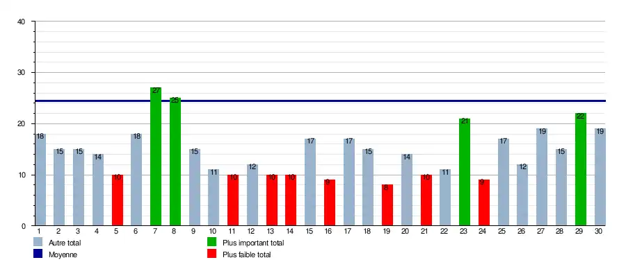 | Journées → | 1 | 2 | 3 | 4 | 5 | 6 | 7 | 8 | 9 | 10 | 11 | 12 | 13 | 14 | 15 | 16 | 17 | 18 | 19 | 20 | 21 | 22 | 23 | 24 | 25 | 26 | 27 | 28 | 29 | 30 | En tête | Relégable |