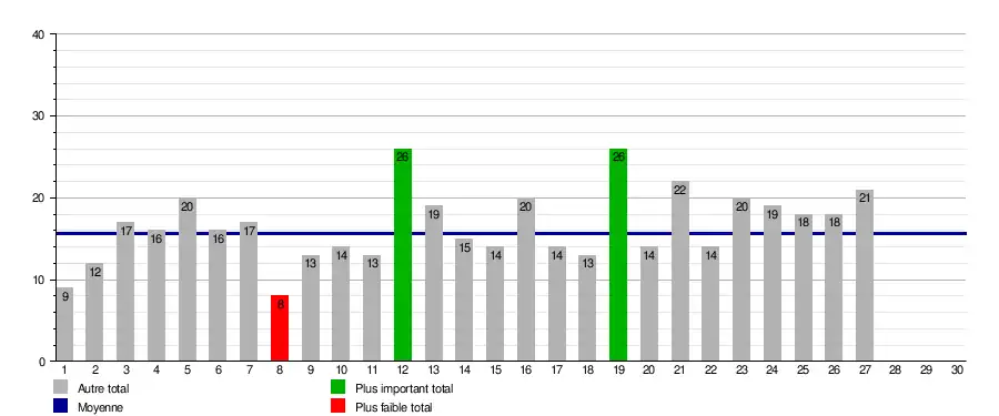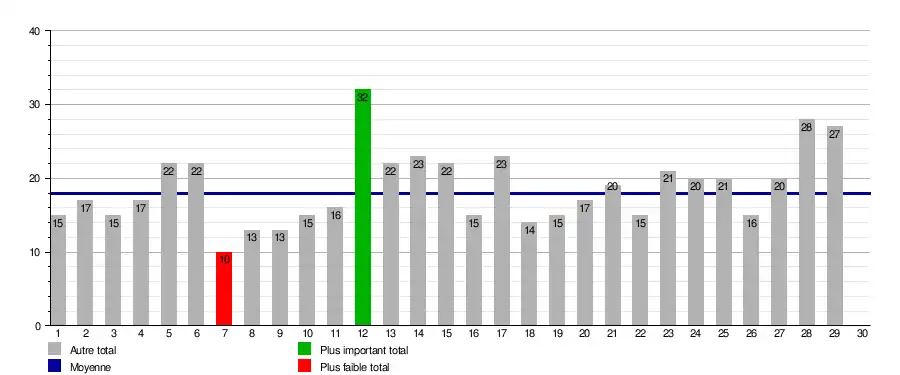 Ce graphique représente le nombre de buts marqués lors de chaque journée, soit un total de 448 buts (moyenne de 15.5 buts par journée).