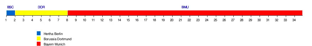 | Bayern Munich | 3 | 2 | 3 | 2 | 2 | 2 | 2 | 1 | 1 | 1 | 1 | 1 | 1 | 1 | 1 | 1 | 1 | 1 | 1 | 1 | 1 | 1 | 1 | 1 | 1 | 1 | 1 | 1 | 1 | 1 | 1 | 1 | 1 | 1 | 27 | |