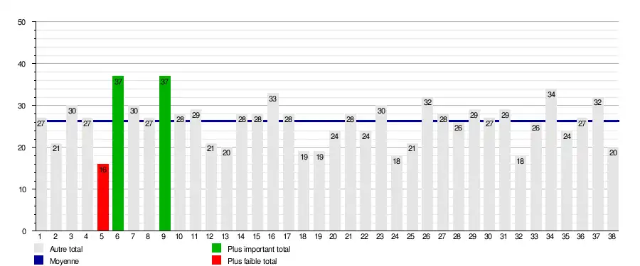 | Journée → | 1 | 2 | 3 | 4 | 5 | 6 | 7 | 8 | 9 | 10 | 11 | 12 | 13 | 14 | 15 | 16 | 17 | 18 | 19 | 20 | 21 | 22 | 23 | 24 | 25 | 26 | 27 | 28 | 29 | 30 | 31 | 32 | 33 | 34 | 35 | 36 | 37 | 38 |