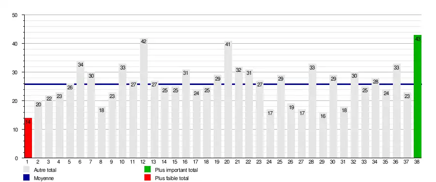 | Journée → | 1 | 2 | 3 | 4 | 5 | 6 | 7 | 8 | 9 | 10 | 11 | 12 | 13 | 14 | 15 | 16 | 17 | 18 | 19 | 20 | 21 | 22 | 23 | 24 | 25 | 26 | 27 | 28 | 29 | 30 | 31 | 32 | 33 | 34 | 35 | 36 | 37 | 38 |