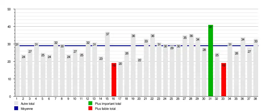 | Journée → | 1 | 2 | 3 | 4 | 5 | 6 | 7 | 8 | 9 | 10 | 11 | 12 | 13 | 14 | 15 | 16 | 17 | 18 | 19 | 20 | 21 | 22 | 23 | 24 | 25 | 26 | 27 | 28 | 29 | 30 | 31 | 32 | 33 | 34 | 35 | 36 | 37 | 38 |