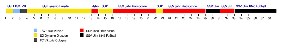 | Unterhaching | 6 | 3 | 5 | 2 | 3 | 4 | 8 | 11 | 7 | 9 | 9 | 14 | 11 | 6 | 6 | 6 | 5 | 7 | 5 | 6 | 10 | 7 | 11 | 7 | 11 | 10 | 11 | 8 | 6 | 8 | 8 | 9 | 8 | 11 | 8 | 7 | 8 | 9 |