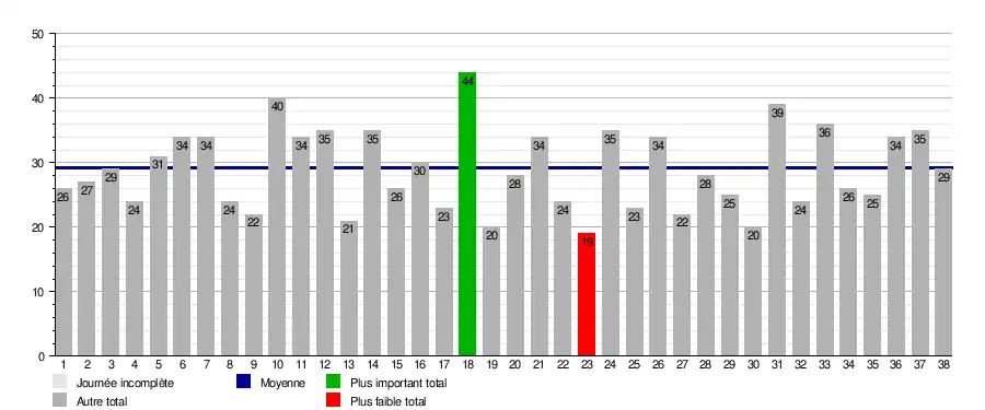 | Journée → | 1 | 2 | 3 | 4 | 5 | 6 | 7 | 8 | 9 | 10 | 11 | 12 | 13 | 14 | 15 | 16 | 17 | 18 | 19 | 20 | 21 | 22 | 23 | 24 | 25 | 26[α] | 27 | 28 | 29 | 30 | 31 | 32 | 33 | 34 | 35 | 36 | 37[α] | 38 |