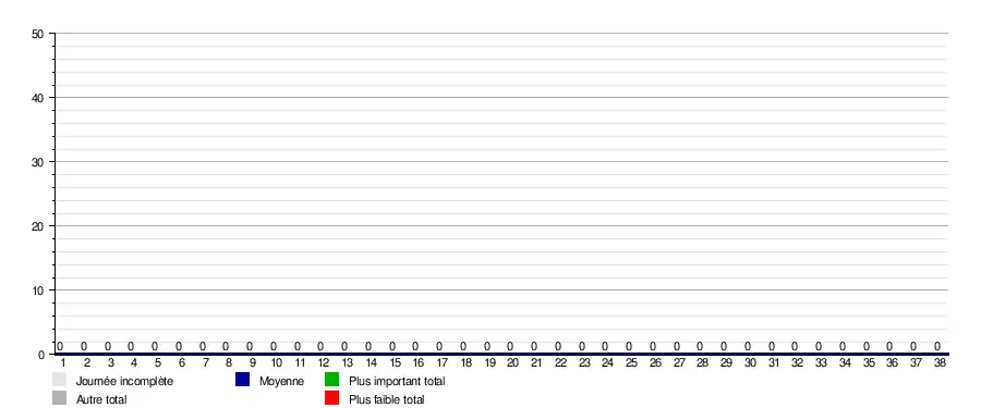 | Journée → | 1 | 2 | 3 | 4 | 5 | 6 | 7 | 8 | 9 | 10 | 11 | 12 | 13 | 14 | 15 | 16 | 17 | 18 | 19 | 20 | 21 | 22 | 23 | 24 | 25 | 26 | 27 | 28 | 29 | 30 | 31 | 32 | 33 | 34 | 35 | 36 | 37 | 38 |