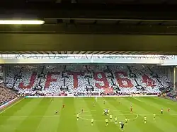 Kop d'Anfield en 1983. La tribune est complètement assise aujourd'hui.- La tribune Stretford End d'Old Trafford en 1992, avant les travaux du rapport Taylor.