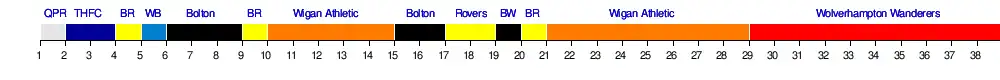 | Résultats (▼dom., ►ext.) | ARS | ASVI | BLR | BOL | CHE | EVE | FUL | LIV | MCI | MUFC | NEW | NOR | QPR | STO | SUN | SWA | TOT | WBA | WIG | WOL |