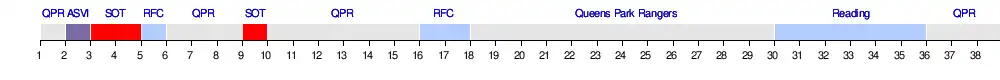 | Queens Park Rangers | 19 | 18 | 19 | 18 | 19 | 20 | 20 | 20 | 20 | 19 | 20 | 20 | 20 | 20 | 20 | 20 | 19 | 19 | 20 | 20 | 20 | 20 | 20 | 20 | 20 | 20 | 20 | 20 | 20 | 20 | 19 | 19 | 19 | 19 | 19 | 20 | 20 | 20 | 0 | 38 |