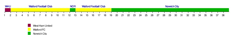 | Norwich | 16 | 11 | 17 | 19 | 13 | 16 | 17 | 19 | 19 | 19 | 19 | 20 | 18 | 19 | 19 | 19 | 19 | 19 | 20 | 20 | 20 | 20 | 20 | 20 | 20 | 20 | 20 | 20 | 20 | 20 | 20 | 20 | 20 | 20 | 20 | 20 | 20 | 20 | 32 | |