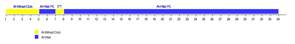 | Al-Hilal | 2 | 4 | 3 | 3 | 1 | 1 | 2 | 1 | 1 | 1 | 1 | 1 | 1 | 1 | 1 | 1 | 1 | 1 | 1 | 1 | 1 | 1 | 1 | 1 | 1 | 1 | 1 | 1 | 1 | 1 | 1 | 26 | ||||