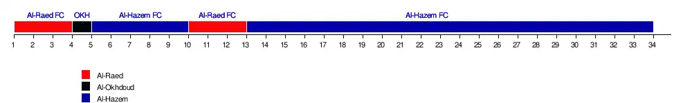 | Al-Hazem | 17 | 17 | 17 | 16 | 18 | 18 | 18 | 18 | 18 | 17 | 17 | 17 | 18 | 18 | 18 | 18 | 18 | 18 | 18 | 18 | 18 | 18 | 18 | 18 | 18 | 18 | 18 | 18 | 18 | 18 | 29 | |||||