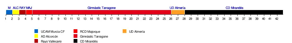 | Mirandés | 14 | 13 | 6 | 6 | 4 | 6 | 4 | 4 | 4 | 5 | 10 | 14 | 18 | 19 | 19 | 22 | 19 | 20 | 18 | 19 | 19 | 20 | 21 | 21 | 21 | 20 | 21 | 22 | 22 | 22 | 22 | 22 | 22 | 22 | 22 | 22 | 22 | 22 | 22 | 22 | 22 | 22 |