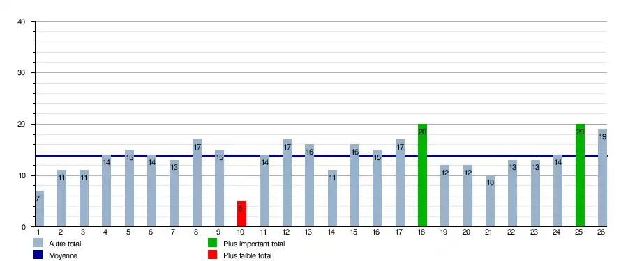 | Journées → | 1 | 2 | 3 | 4 | 5 | 6 | 7 | 8 | 9 | 10 | 11 | 12 | 13 | 14 | 15 | 16 | 17 | 18 | 19 | 20 | 21 | 22 | 23 | 24 | 25 | 26 | En tête | Relégable |