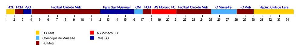 - : fin des matchs aller. Le FC Metz est en tête (34pts) devant l'Olympique de Marseille (33pts) et l'AS Monaco (32pts). Le RC Lens n'est que sixième avec 28 pts.