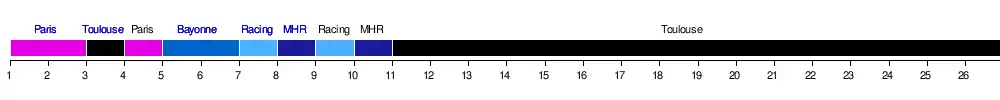 | 1 | Stade toulousain | 26 | 8 | 33 | 5 | +179 | 82 |