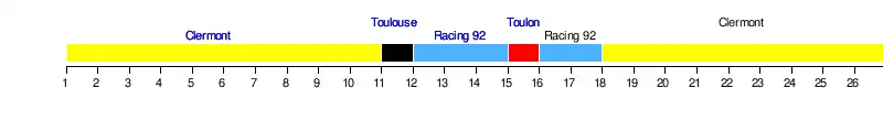 | Racing 92 | 6 | 3 | 5 | 4 | 4 | 3 | 2 | 3 | 2 | 4 | 2 | 1 | 1 | 1 | 2 | 1 | 1 | 2 | 4 | 3 | 4 | 3 | 4 | 4 | 4 | 4 |