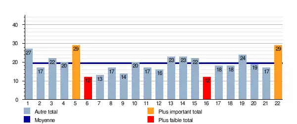 Ce graphique représente le nombre de buts marqués lors de chaque journée. Il est également indiqué la moyenne totale sur la saison qui est de 19,5 buts/journée.