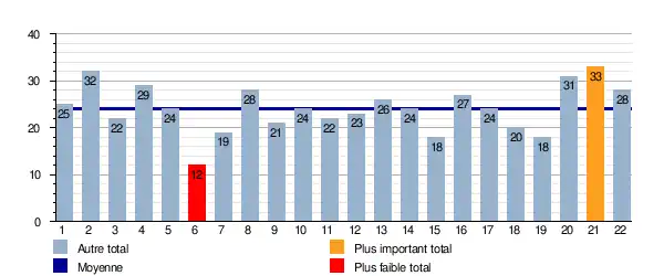 Ce graphique représente le nombre de buts marqués lors de chaque journée. Il est également indiqué la moyenne total sur la saison qui est de 24,09 buts/journée.