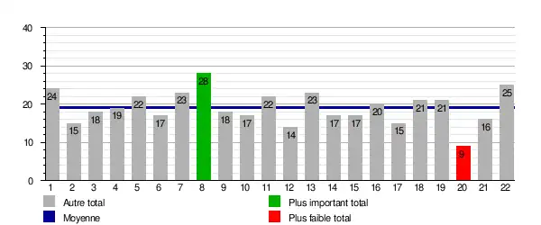 | Journées → | 1 | 2 | 3 | 4 | 5 | 6 | 7 | 8 | 9 | 10 | 11 | 12 | 13 | 14 | 15 | 16 | 17 | 18 | 19 | 20 | 21 | 22 | Lead | Rel. |