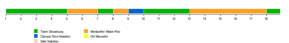 | Olympic Nice Natation | 9* | 3 | 5** | 3 | 2 | 4 | 2 | 2 | 1 | 4* | 4 | 5 | 4 | 4 | 4 | 4 | 3 | 4 | 1 | 15 |