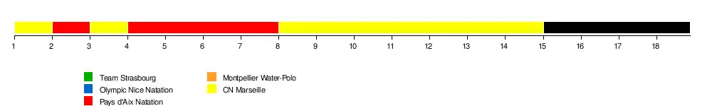 | Cercle des nageurs de Marseille | 0-0 | 17-8 | 12-9 | X-X | 0-0 | 18-4 | 0-0 | 16-6 | 12-9 | 12-4 |