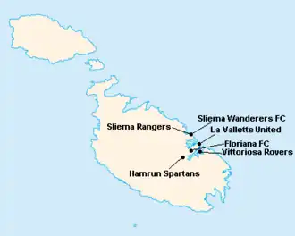 L'île de Malte étant relativement petite, les clubs évoluent tous au stade National Ta'Qali (17 400 places). Certains cependant ont leur propre enceinte qu'ils peuvent éventuellement utiliser.
