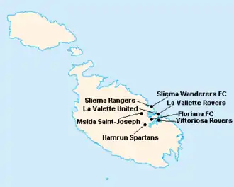 L'île de Malte étant relativement petite, les clubs évoluent tous au stade National Ta'Qali (17 400 places). Certains cependant ont leur propre enceinte qu'ils peuvent éventuellement utiliser.