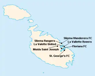 L'île de Malte étant relativement petite, les clubs évoluent tous au stade National Ta'Qali (17 400 places). Certains cependant ont leur propre enceinte qu'ils peuvent éventuellement utiliser.
