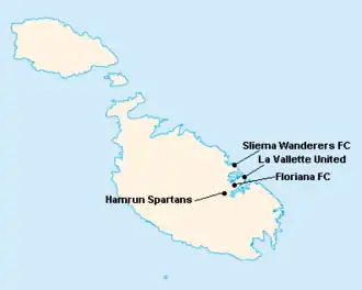 L'île de Malte étant relativement petite, les clubs évoluent tous au stade National Ta'Qali (17 400 places). Certains cependant ont leur propre enceinte qu'ils peuvent éventuellement utiliser.