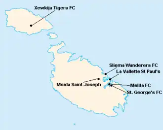 L'île de Malte étant relativement petite, les clubs évoluent tous au stade National Ta'Qali (17 400 places). Certain cependant ont leur propre enceinte qu'ils peuvent éventuellement utiliser.
