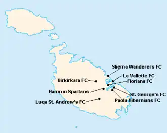 L'île de Malte étant relativement petite, les clubs évoluent tous au stade National Ta'Qali (17 400 places). Certain cependant ont leur propre enceinte qu'ils peuvent éventuellement utiliser.