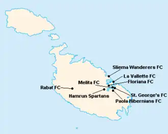 L'île de Malte étant relativement petite, les clubs évoluent tous au stade National Ta'Qali (17 400 places). Certain cependant ont leur propre enceinte qu'ils peuvent éventuellement utiliser.