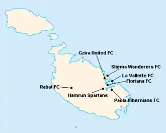 L'île de Malte étant relativement petite, les clubs évoluent tous au stade National Ta'Qali (17 400 places). Certain cependant ont leur propre enceinte qu'ils peuvent éventuellement utiliser.