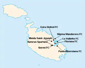 L'île de Malte étant relativement petite, les clubs évoluent tous au stade National Ta'Qali (17 400 places). Certain cependant ont leur propre enceinte qu'ils peuvent éventuellement utiliser.