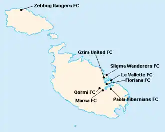 L'île de Malte étant relativement petite, les clubs évoluent tous au stade National Ta'Qali (17 400 places). Certain cependant ont leur propre enceinte qu'ils peuvent éventuellement utiliser.