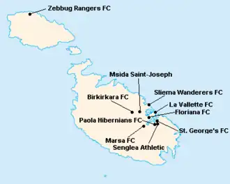 L'île de Malte étant relativement petite, les clubs évoluent tous au stade National Ta'Qali (17 400 places). Certain cependant ont leur propre enceinte qu'ils peuvent éventuellement utiliser.