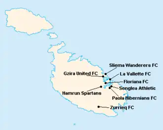 L'île de Malte étant relativement petite, les clubs évoluent tous au stade National Ta'Qali (17 400 places). Certain cependant ont leur propre enceinte qu'ils peuvent éventuellement utiliser.