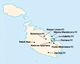 L'île de Malte étant relativement petite, les clubs évoluent tous au stade National Ta'Qali (17 400 places). Certain cependant ont leur propre enceinte qu'ils peuvent éventuellement utiliser.