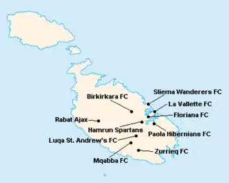 L'île de Malte étant relativement petite, les clubs évoluent tous au stade National Ta'Qali (17 400 places). Certain cependant ont leur propre enceinte qu'ils peuvent éventuellement utiliser.
