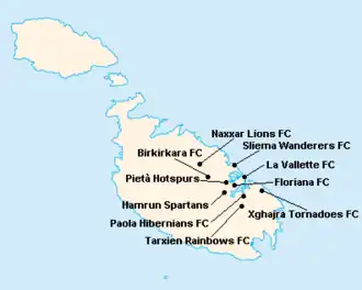 L'île de Malte étant relativement petite, les clubs évoluent tous au stade National Ta'Qali (17 400 places). Certain cependant ont leur propre enceinte qu'ils peuvent éventuellement utiliser.