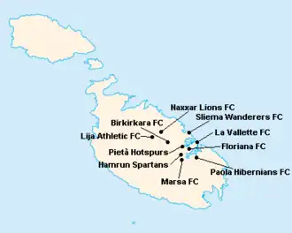 L'île de Malte étant relativement petite, les clubs évoluent tous au stade National Ta'Qali (17 400 places). Certain cependant ont leur propre enceinte qu'ils peuvent éventuellement utiliser.
