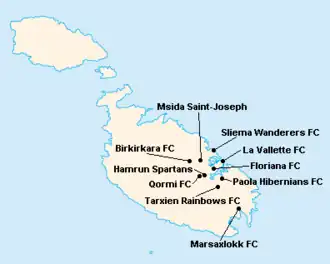 L'île de Malte étant relativement petite, les clubs évoluent tous au stade National Ta'Qali (17 400 places). Certain cependant ont leur propre enceinte qu'ils peuvent éventuellement utiliser.