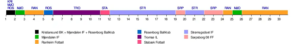 | Ranheim Fotball | 13 | 15 | 16 | 16 | 14 | 9 | 12 | 12 | 9 | 9 | 10 | 10 | 10 | 11 | 14 | 14 | 11 | 13 | 14 | 14 | 15 | 15 | 15 | 16 | 14 | 16 | 16 | 16 | 16 | 16 | 12 |