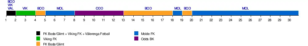 | Molde | 7 | 3 | 6 | 4 | 1 | 1 | 1 | 4 | 2 | 3 | 3 | 3 | 3 | 3 | 2 | 2 | 2 | 1 | 2 | 1 | 1 | 1 | 1 | 1 | 1 | 1 | 1 | 1 | 1 | 1 | 15 | |