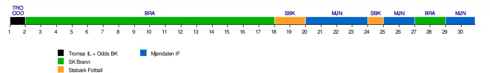 | Tromsø | 15 | 13 | 10 | 13 | 13 | 15 | 11 | 13 | 15 | 14 | 14 | 14 | 14 | 13 | 13 | 13 | 13 | 13 | 13 | 13 | 13 | 13 | 13 | 12 | 11 | 11 | 11 | 12 | 12 | 12 | 0 | 3 |