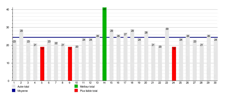 | Journée ? | 1 | 2 | 3 | 4 | 5 | 6 | 7 | 8 | 9 | 10 | 11 | 12 | 13 | 14 | 15 | 16 | 17 | 18 | 19 | 20 | 21 | 22 | 23 | 24 | 25 | 26 | 27 | 28 | 29 | 30 | Journées en tête | Journées relégable |