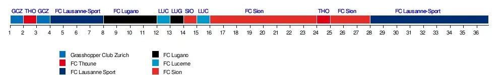 | Sion | 4 | 3 | 5 | 6 | 6 | 7 | 7 | 5 | 6 | 6 | 7 | 7 | 8 | 9 | 10 | 7 | 10 | 10 | 10 | 10 | 10 | 10 | 10 | 10 | 9 | 10 | 10 | 10 | 9 | 9 | 9 | 9 | 9 | 9 | 8 | 6 | 12 | |