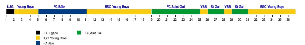 | Lugano | 1 | 1 | 4 | 6 | 7 | 9 | 8 | 8 | 9 | 9 | 8 | 9 | 8 | 8 | 7 | 7 | 6 | 6 | 6 | 7 | 7 | 7 | 7 | 7 | 7 | 7 | 7 | 7 | 7 | 7 | 7 | 7 | 7 | 7 | 6 | 5 | 2 | 4 | |
