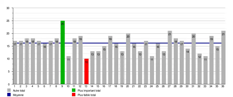 | Journée → | 1 | 2 | 3 | 4 | 5 | 6 | 7 | 8 | 9 | 10 | 11 | 12 | 13 | 14 | 15 | 16 | 17 | 18 | 19 | 20 | 21 | 22 | 23 | 24 | 25 | 26 | 27 | 28 | 29 | 30 | 31 | 32 | 33 | 34 | 35 | 36 | 1er | bar. | rel. |