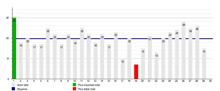 | Journée → | 1 | 2 | 3 | 4 | 5 | 6 | 7 | 8 | 9 | 10 | 11 | 12 | 13 | 14 | 15 | 16 | 17 | 18 | 19 | 20 | 21 | 22 | 23 | 24 | 25 | 26 | 27 | 28 | 29 | 30 | Journées en tête | Journées relégable |